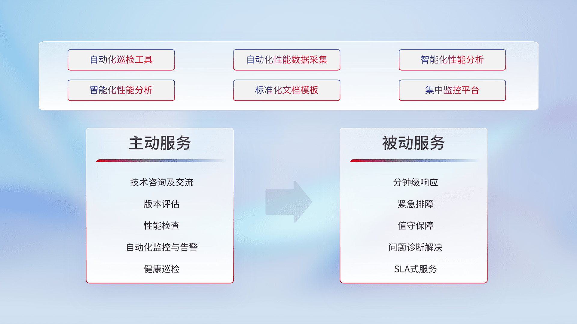 智能化工具和标准化文档,,,,保障服务质量,,,,提供主动服务(包含技术咨询、、版本评估、、性能检查、、、、自动化监控与告警、、、、健康巡检)和被动服务包含(分钟级响应、、、紧急排障、、、值守保障、、问题诊断解决、、SLA服务)。。