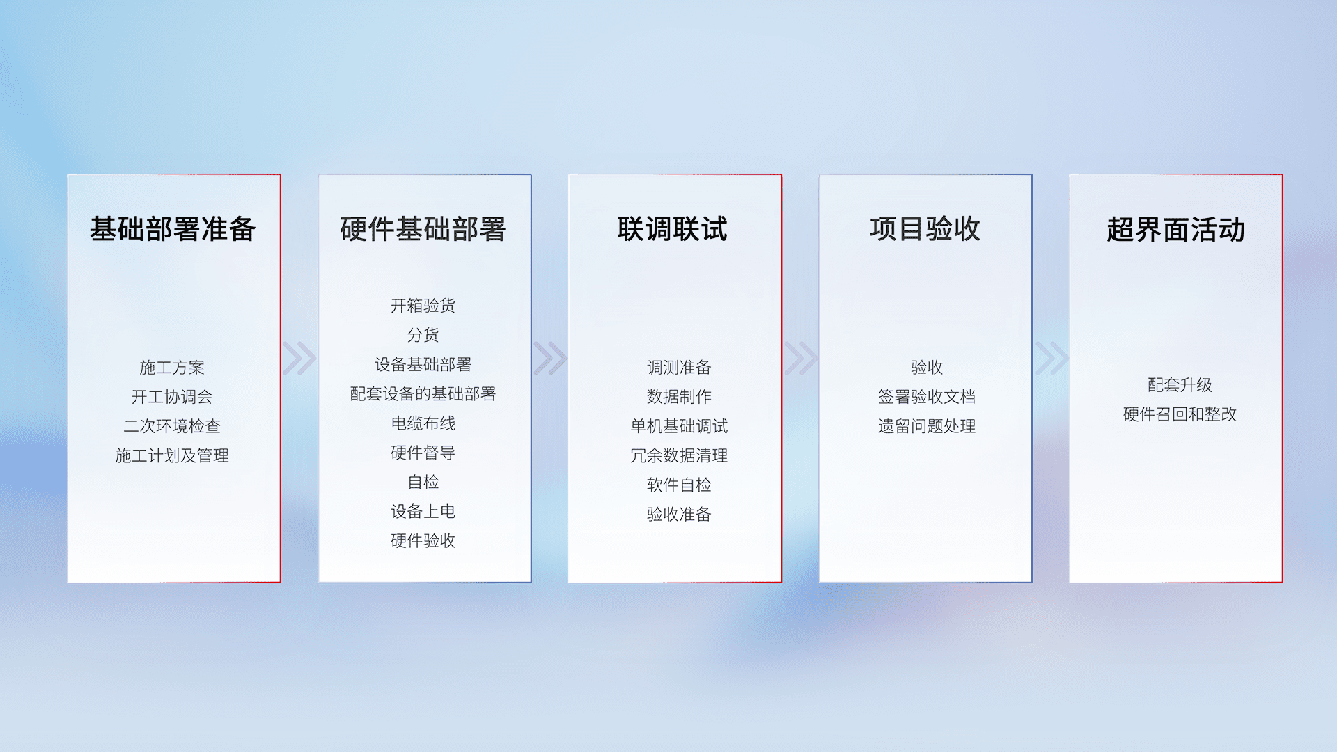 从基础部署准备、、、、硬件基础部署、、联调联试、、项目验收、、、越界面活动的全过程可追溯,,,,保证施工质量和进度。。